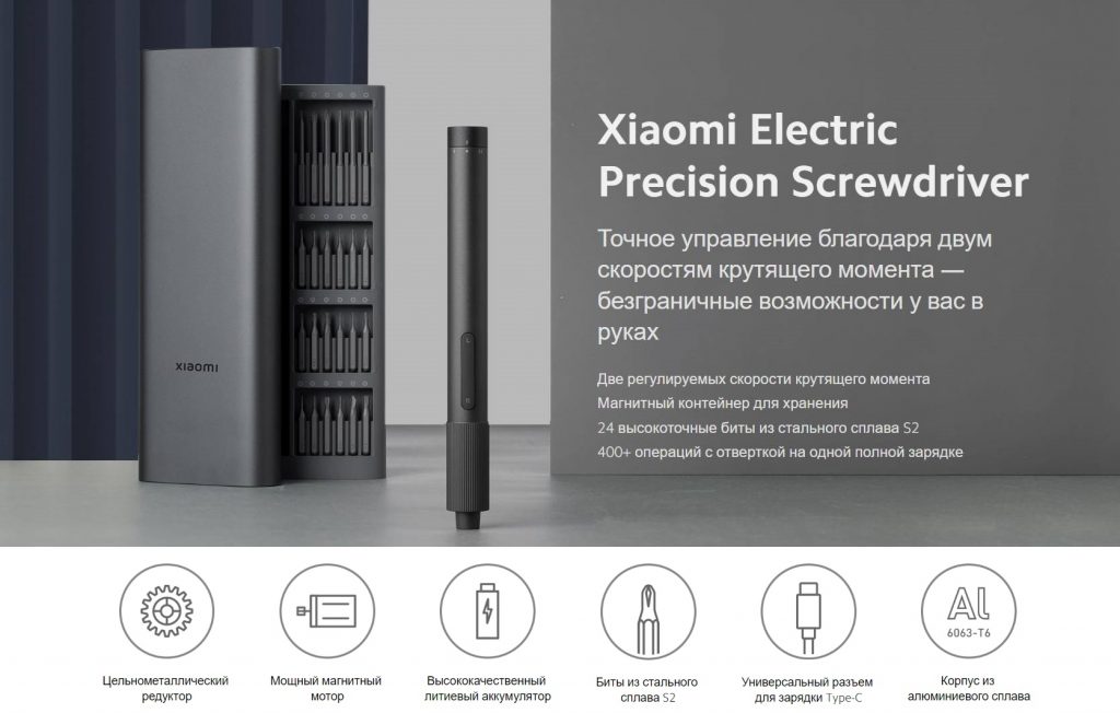 | Комплектация | отвертка, биты для отвертки 24 шт., кабель для зарядки USB Type-C, контейнер для хранения, документация |