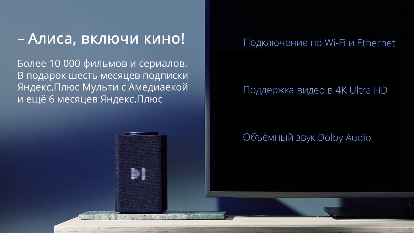 Колонка поставляется с подарком в виде шести месяцев подписки на Яндекс.Плюс Мульти с Амедиатекой и дополнительными шестью месяцами обычной подписки Яндекс.Плюс, поэтому сразу подключения Станции Макс к ТВ можно выбрать что посмотреть из огромного количества фильмов и сериалов. За счёт поддержки 4K можно оценить новый уровень качества картинки и фактически превратить любой телевизор, проектор или монитор в Smart TV.